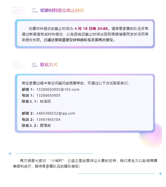 “小城杯” 公益之星创意诉讼大赛重要通知:初赛队伍信息收集渠道变更及报名延期事宜