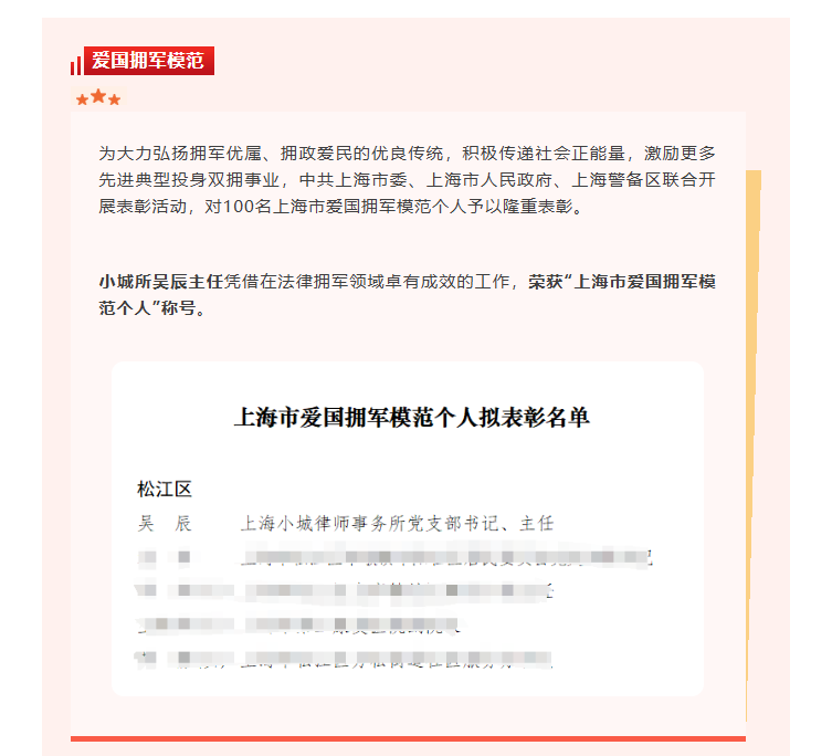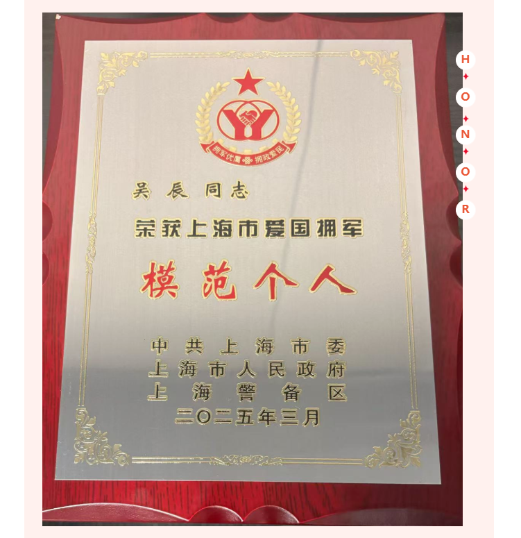 吴辰主任荣获“上海市爱国拥军模范个人”称号