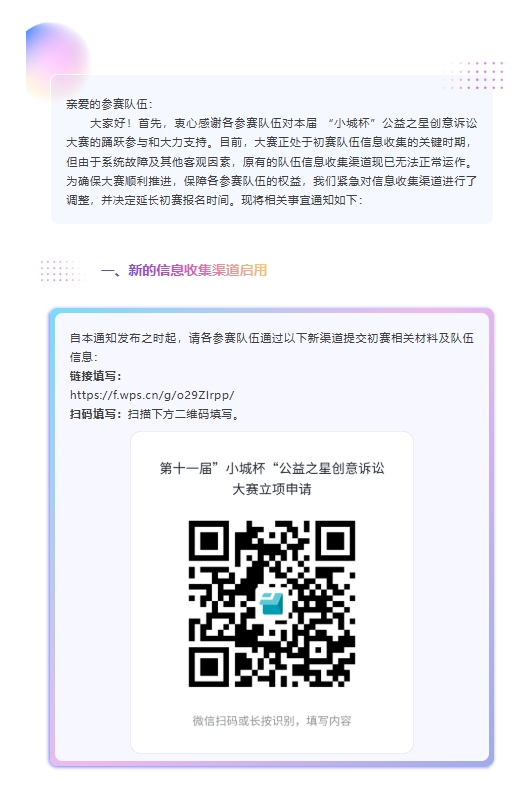 “小城杯” 公益之星创意诉讼大赛重要通知:初赛队伍信息收集渠道变更及报名延期事宜
